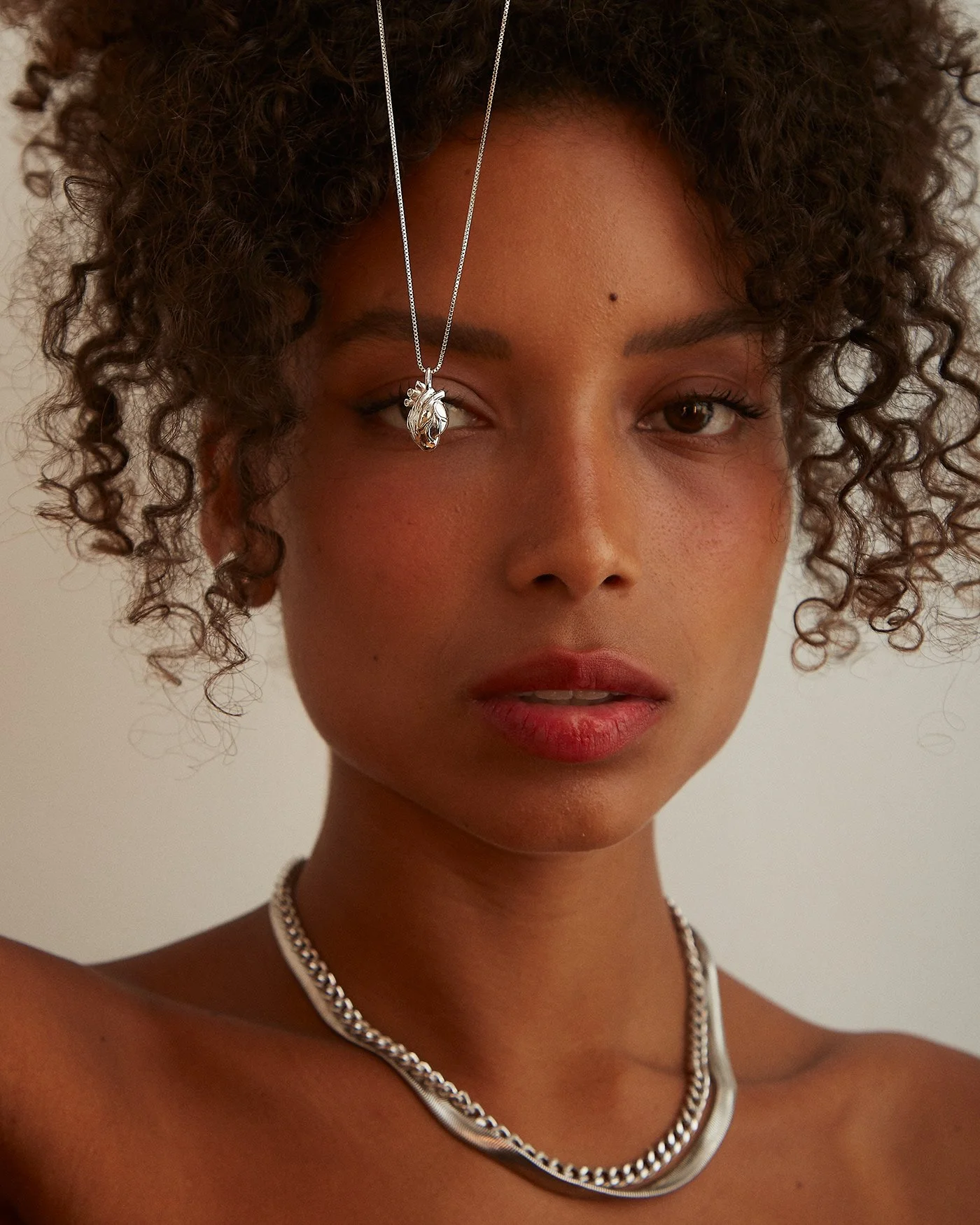 Retrato de uma mulher com cabelo cacheado, usando duas correntes de prata e um colar, com uma peça de joalheria pendurada na corrente próxima ao rosto.