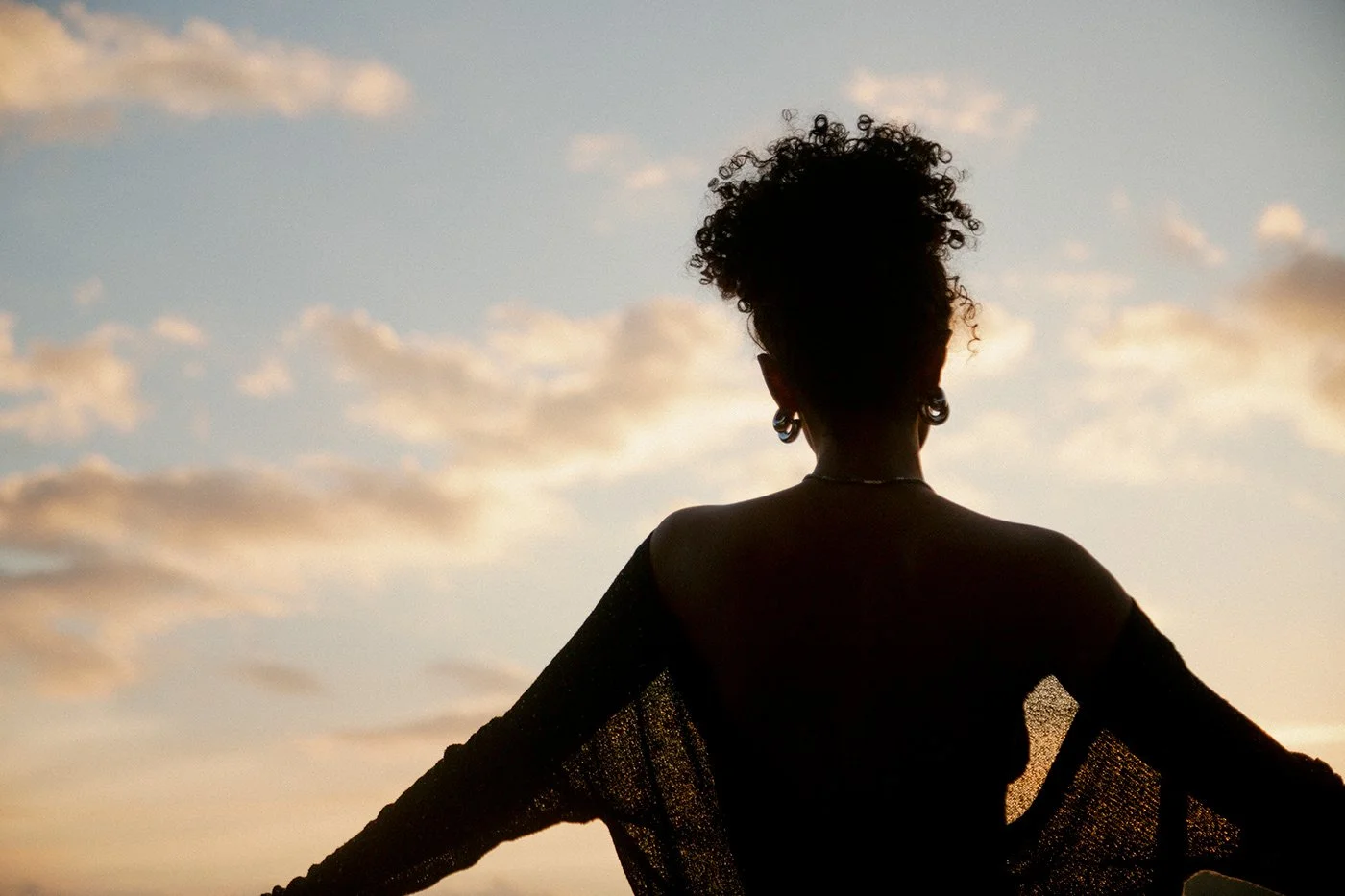 Silhueta de uma mulher com cabelos cacheados ao pôr do sol, com braços abertos, céu com nuvens ao fundo.