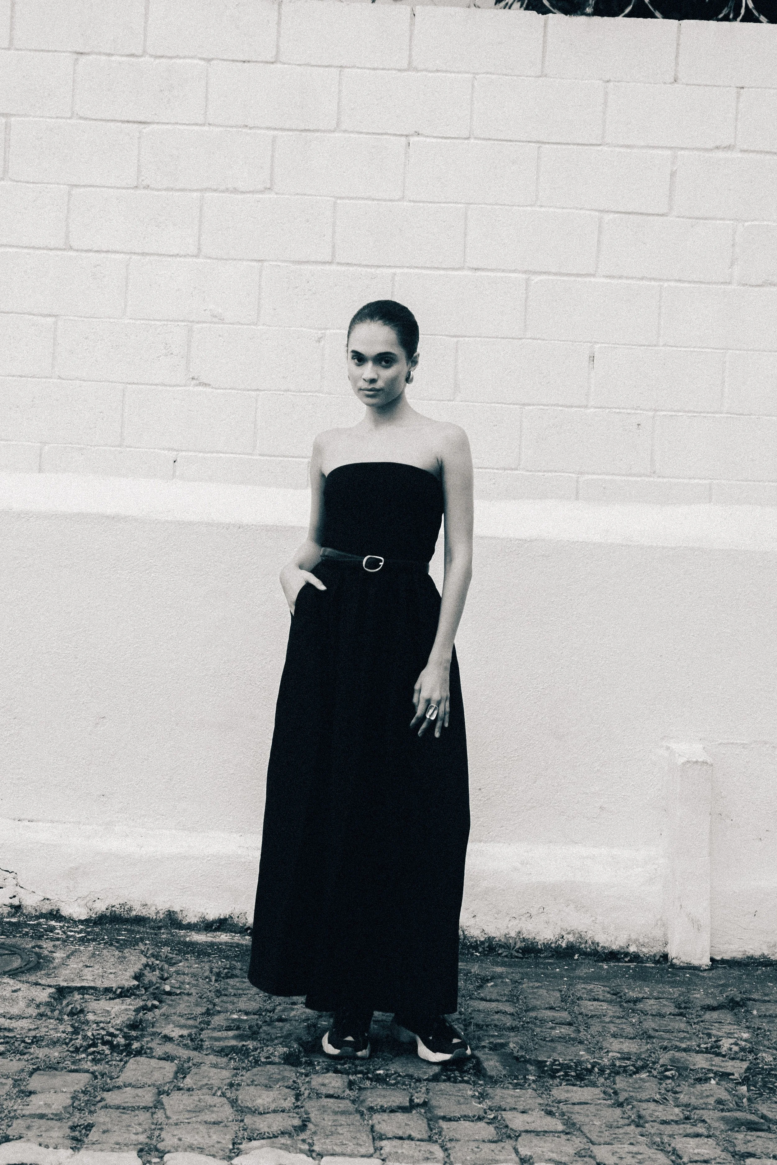 Mulher sentada em uma pedra perto da água, usando biquíni e um roupão com estampa de estrelas, em um ambiente natural com rochas e vegetação ao fundo.