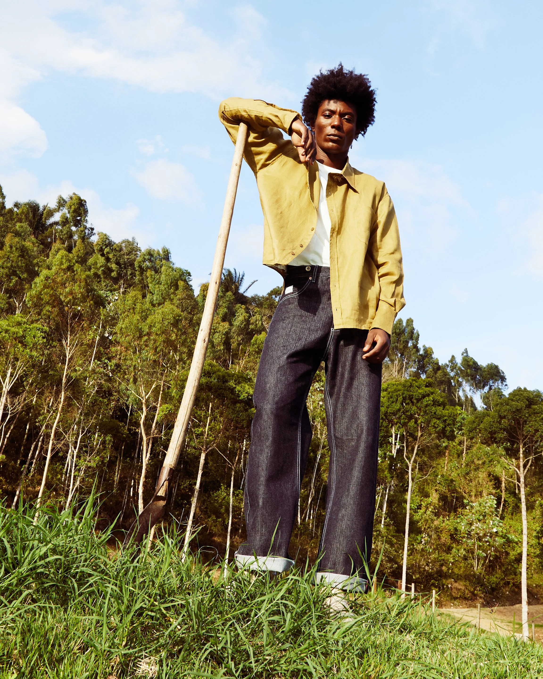 Pessoa de aparência afro com uma mão no rosto, segurando uma pá, ao ar livre, com árvores e céu azul ao fundo.