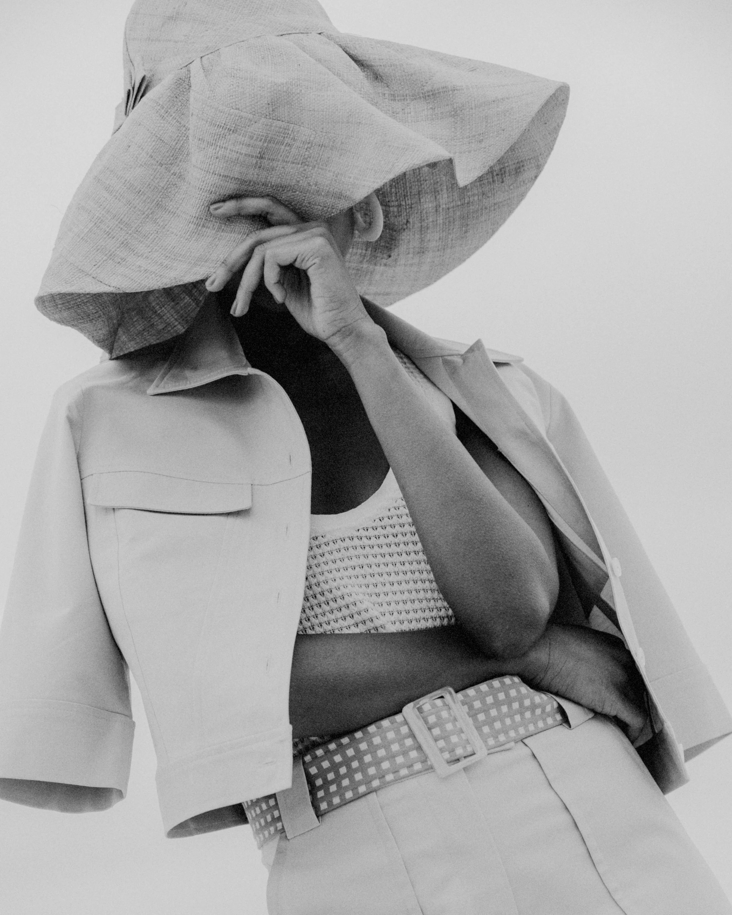 Mulher vestida com roupa clara usando um grande chapéu de palha, com uma blusa de malha branca, uma jaqueta aberta e uma calça com cinto, segurando o chapéu com uma mão, em uma pose artística