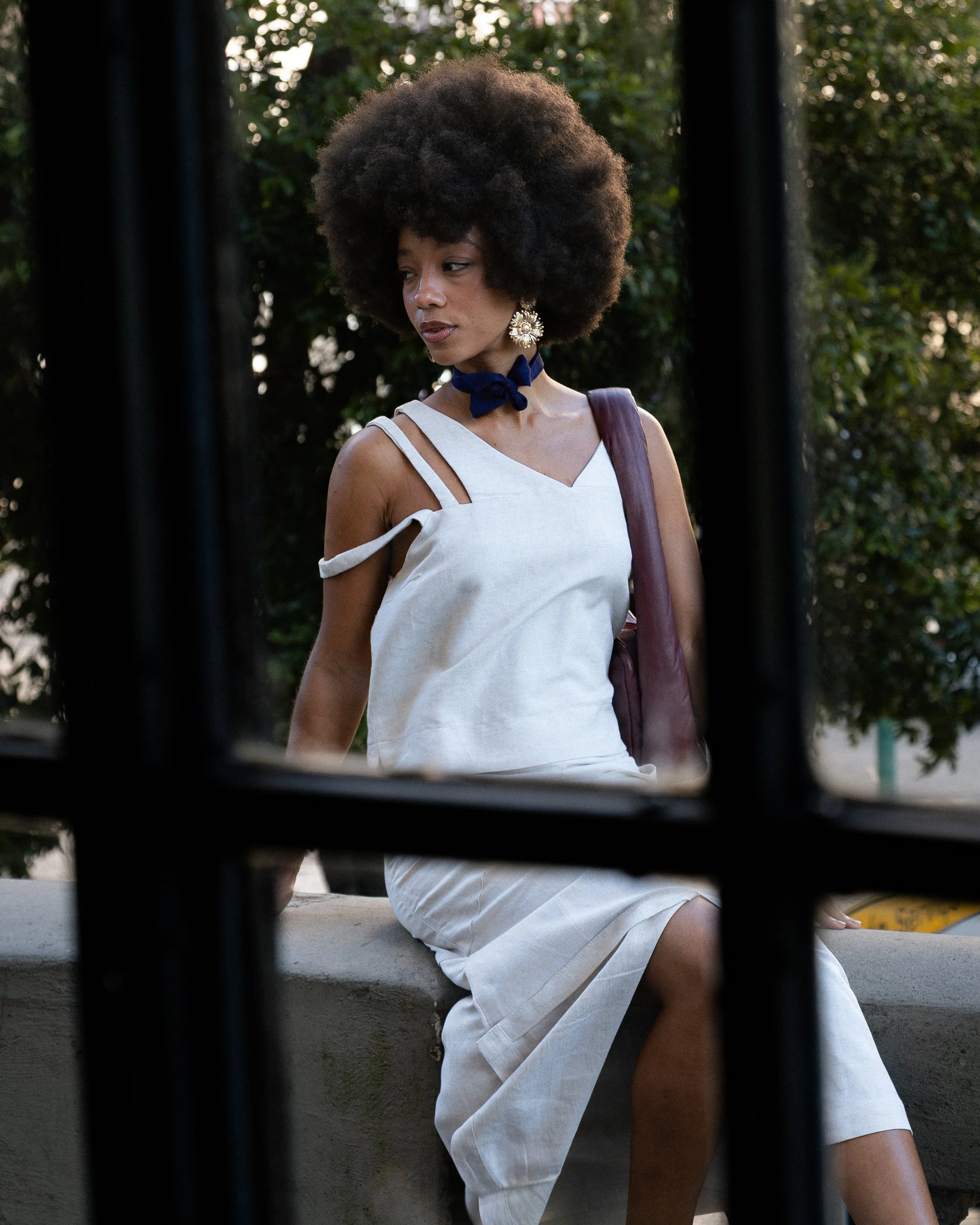 Mulher negra de cabelo afro, vestindo vestido branco com ombros expostos e acessórios dourados, sentada em um muro com árvores ao fundo